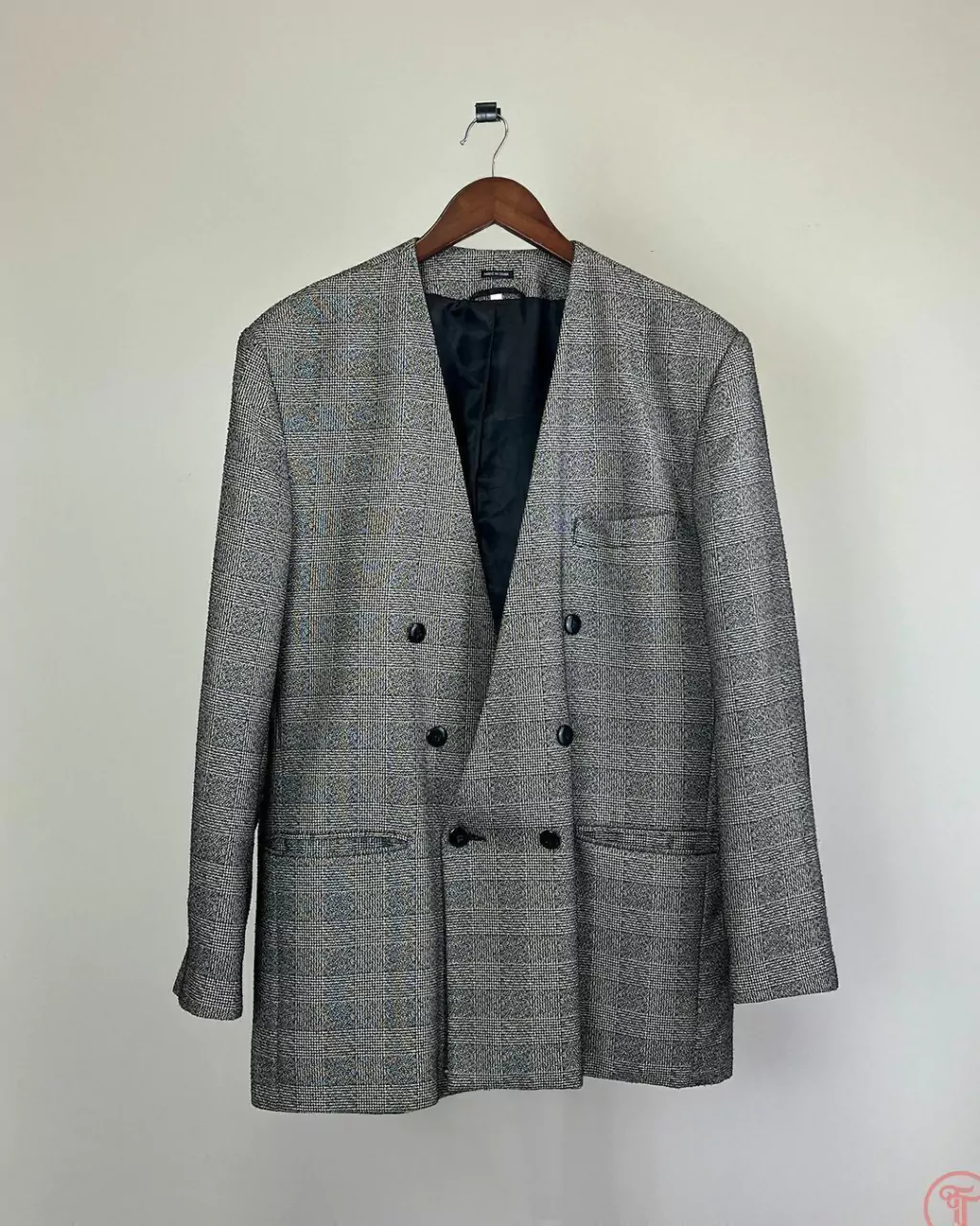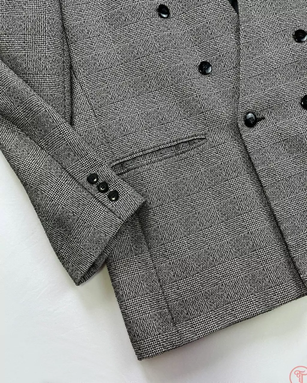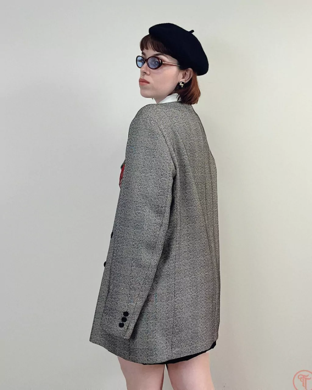 Blazer diferenciado sem lapela com forma v, ombreiras leves, tecido em poliéster e seda artificial, estampa xadrez príncipe de gales, modelagem reta com bolsos internos e externos, forro em poliéster, fechamento em botões duplos. Não possui elasticidade.