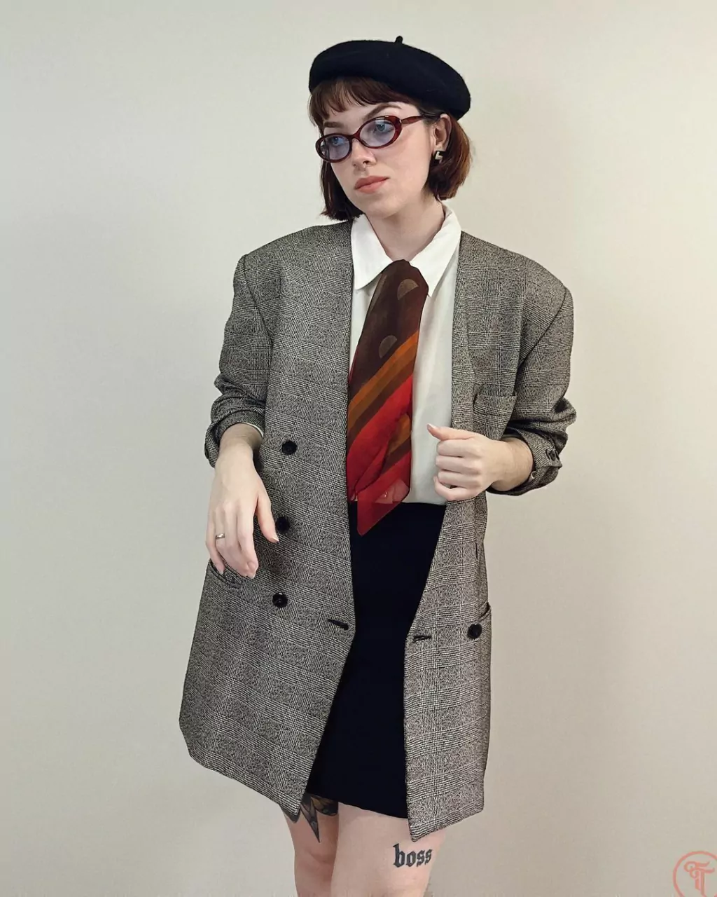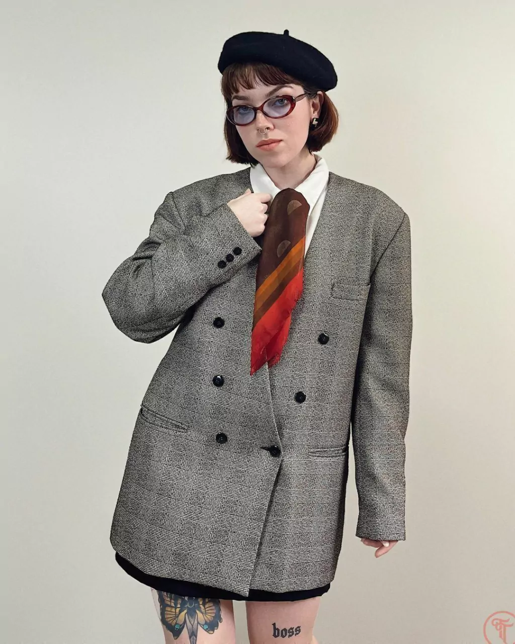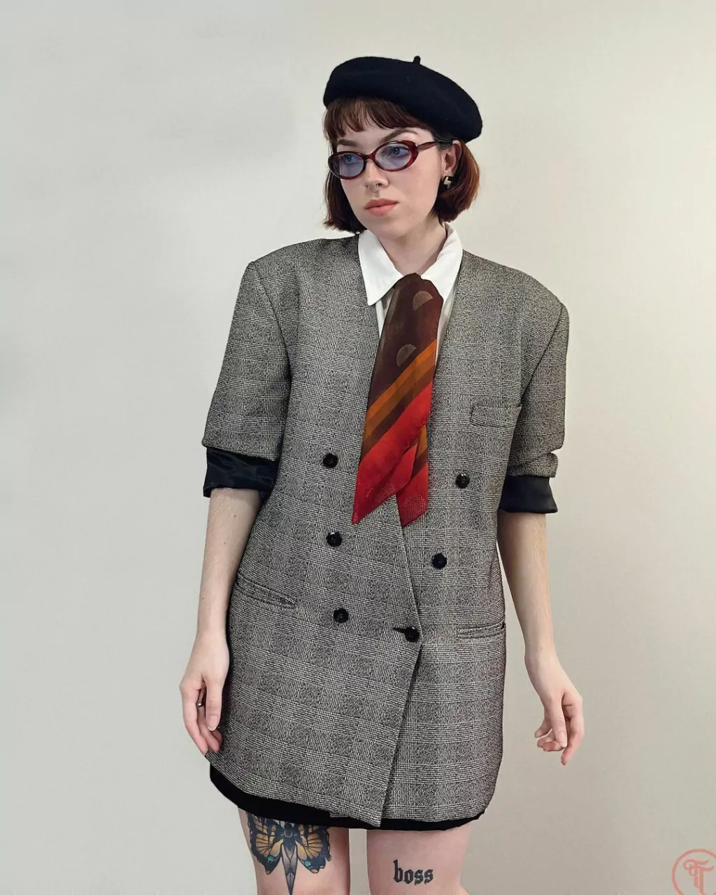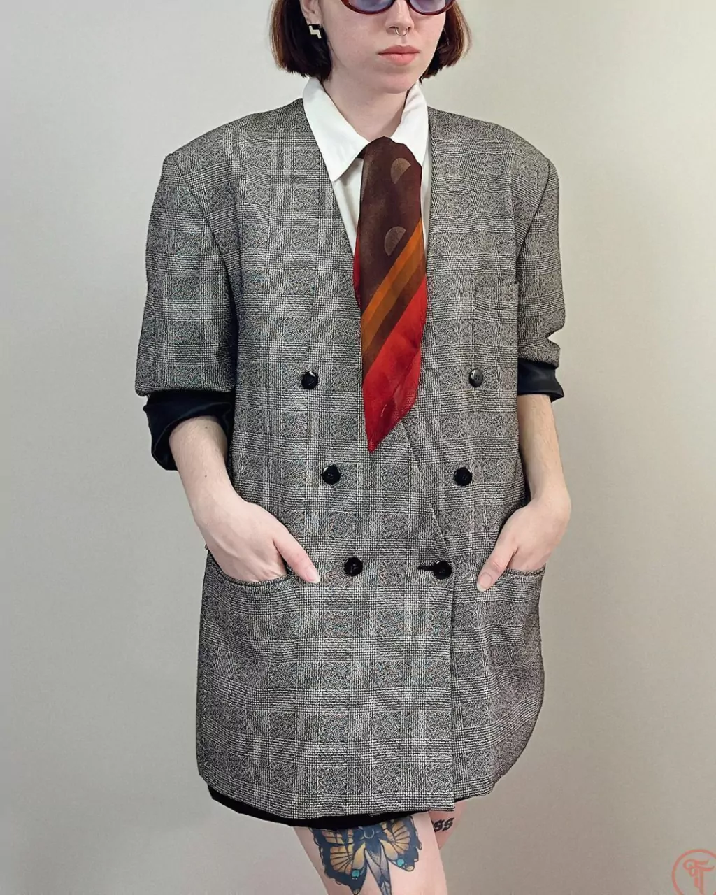 Blazer diferenciado sem lapela com forma v, ombreiras leves, tecido em poliéster e seda artificial, estampa xadrez príncipe de gales, modelagem reta com bolsos internos e externos, forro em poliéster, fechamento em botões duplos. Não possui elasticidade.
