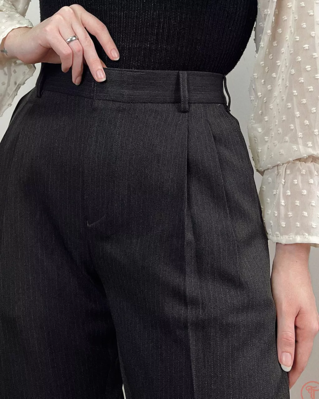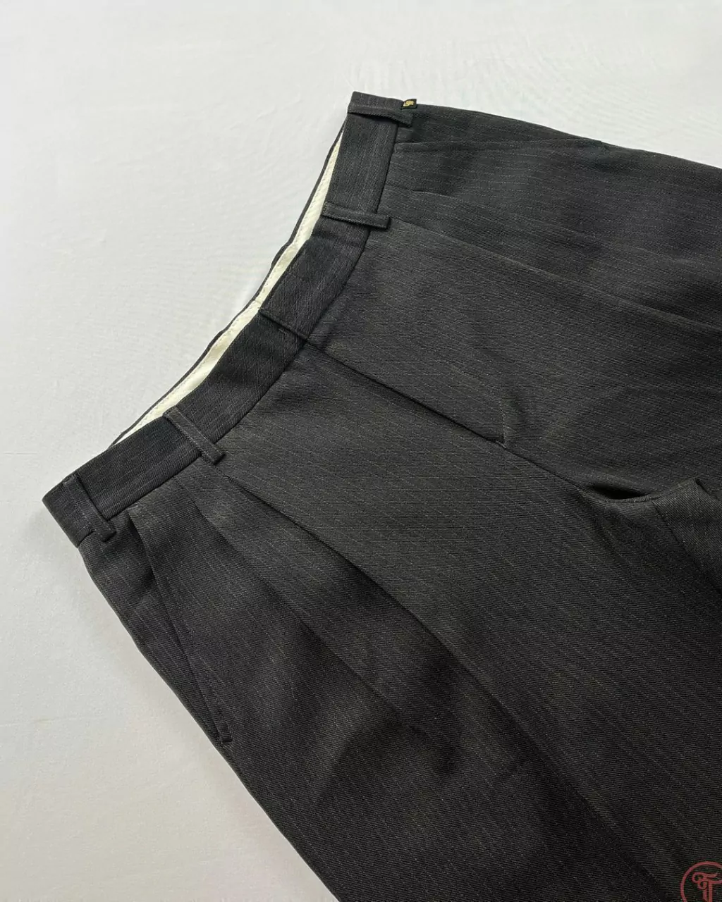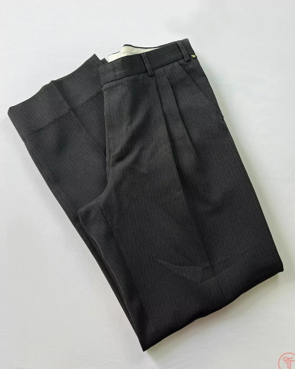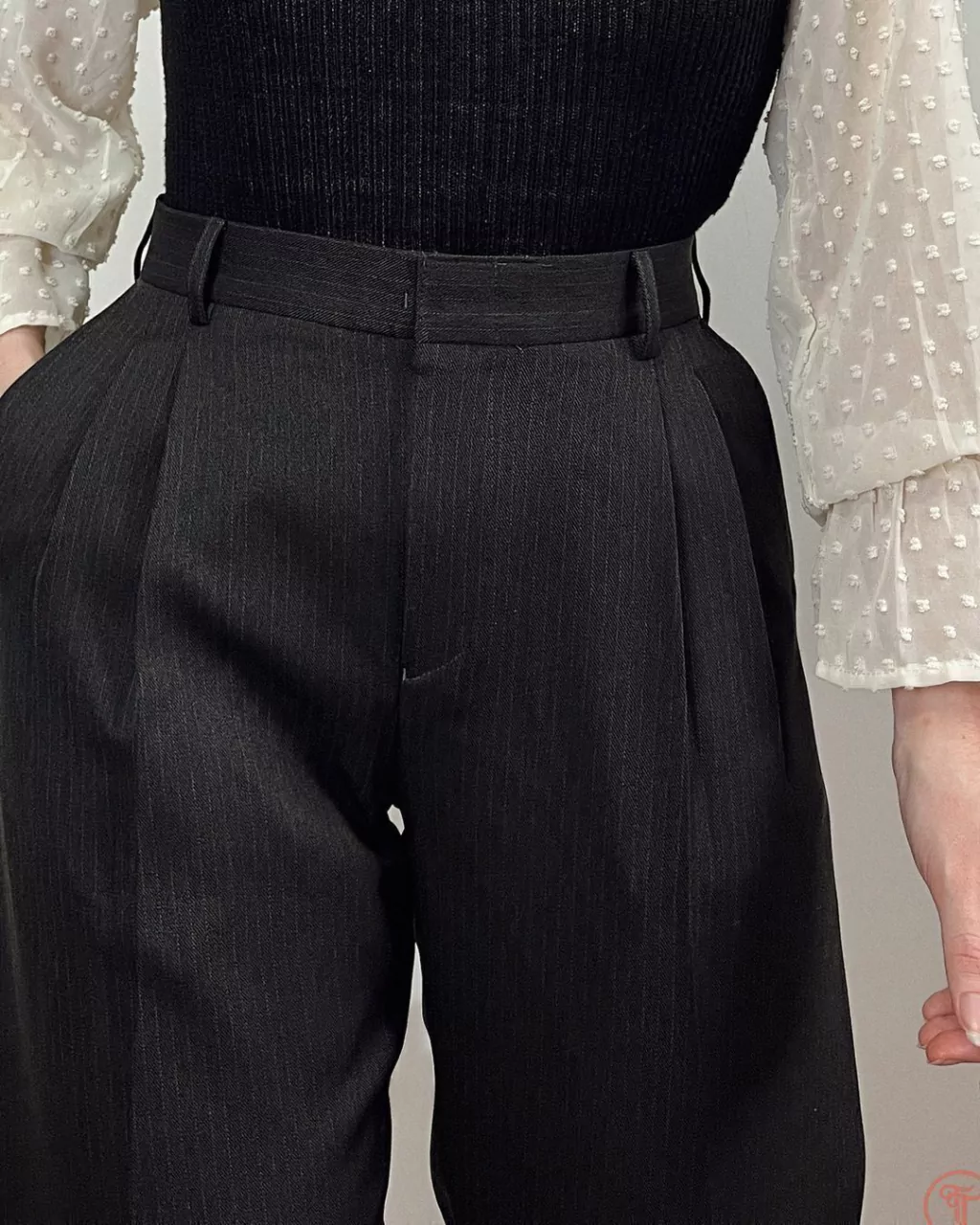 Calça risca de giz com tecido em poliéster, modelagem ampla com pregas, cintura com passantes para cintos, bolsos frontais faca, bolsos traseiros com botão, fechamento em gancho e zíper. Não possui elasticidades.