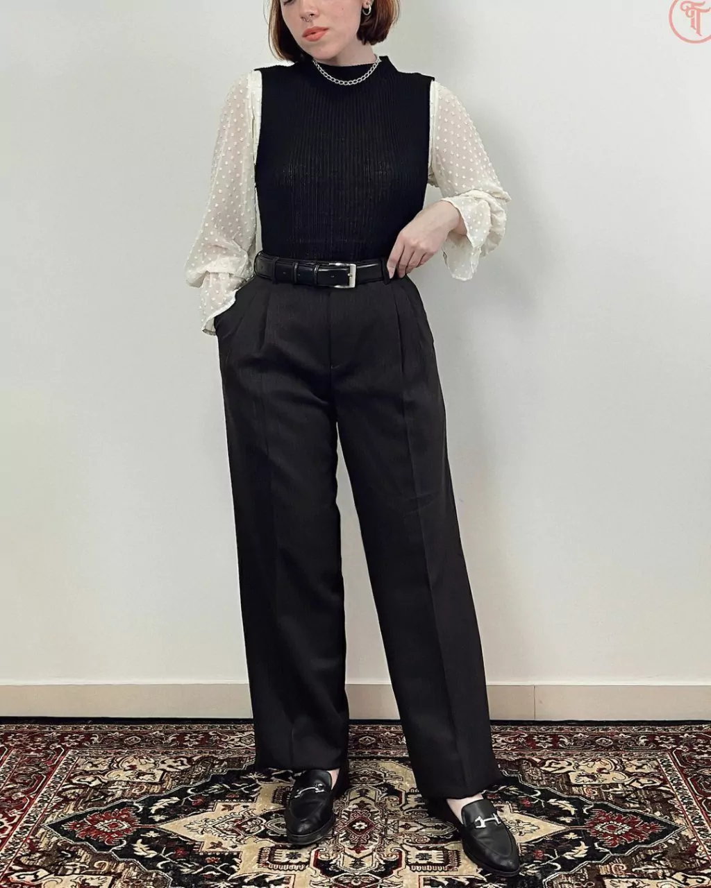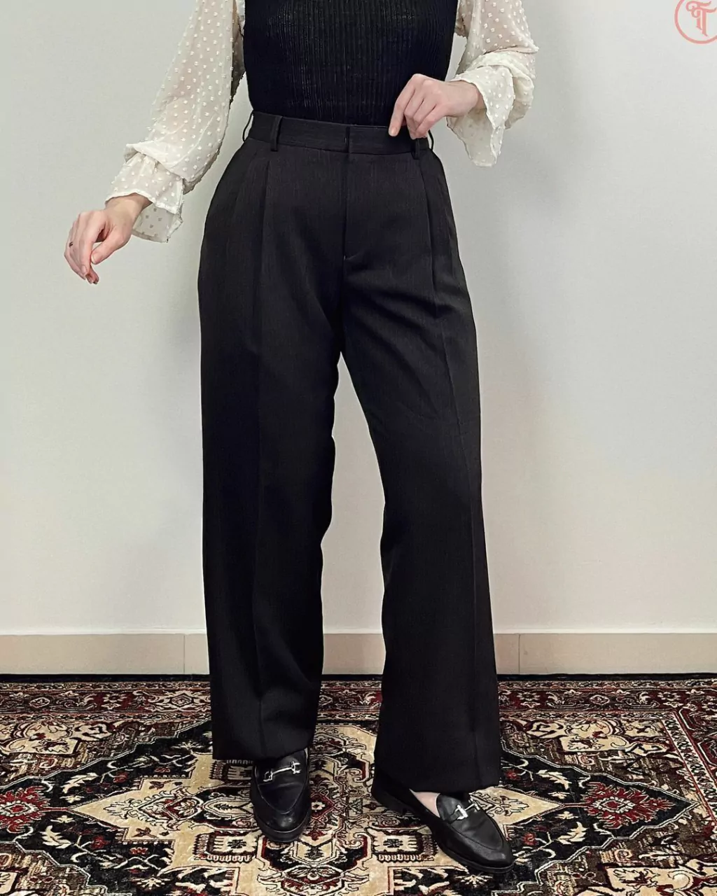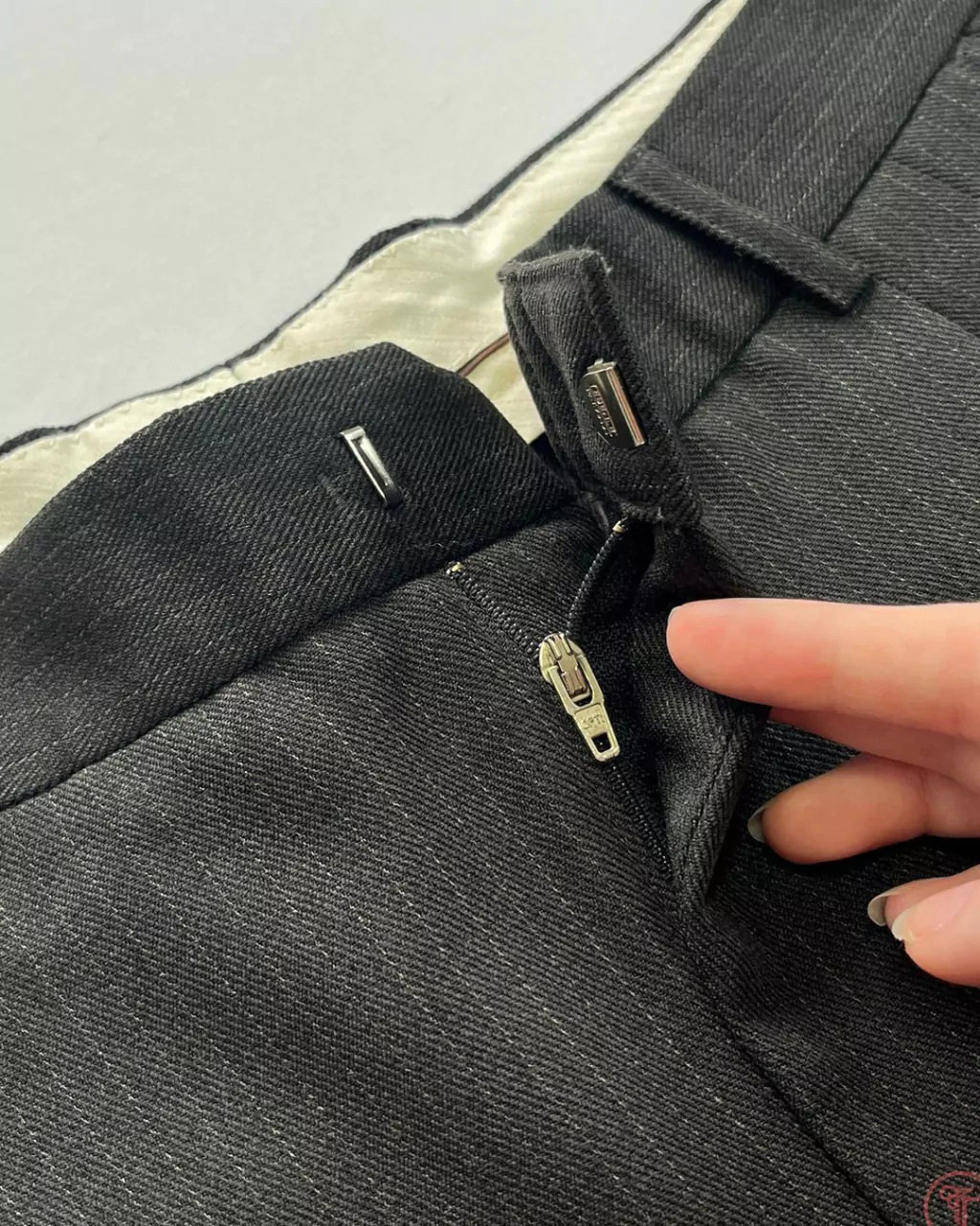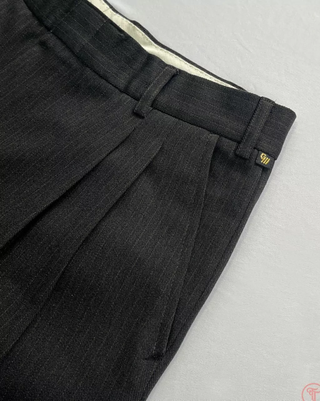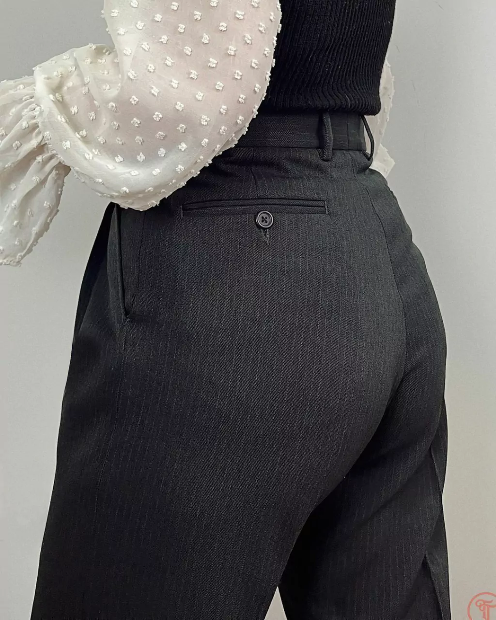Calça risca de giz com tecido em poliéster, modelagem ampla com pregas, cintura com passantes para cintos, bolsos frontais faca, bolsos traseiros com botão, fechamento em gancho e zíper. Não possui elasticidades.
