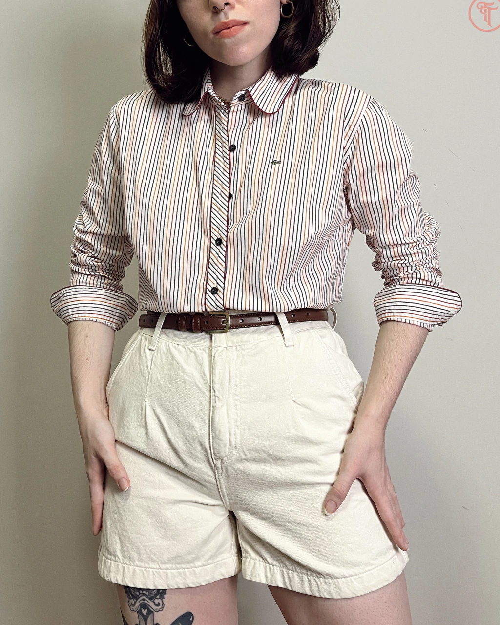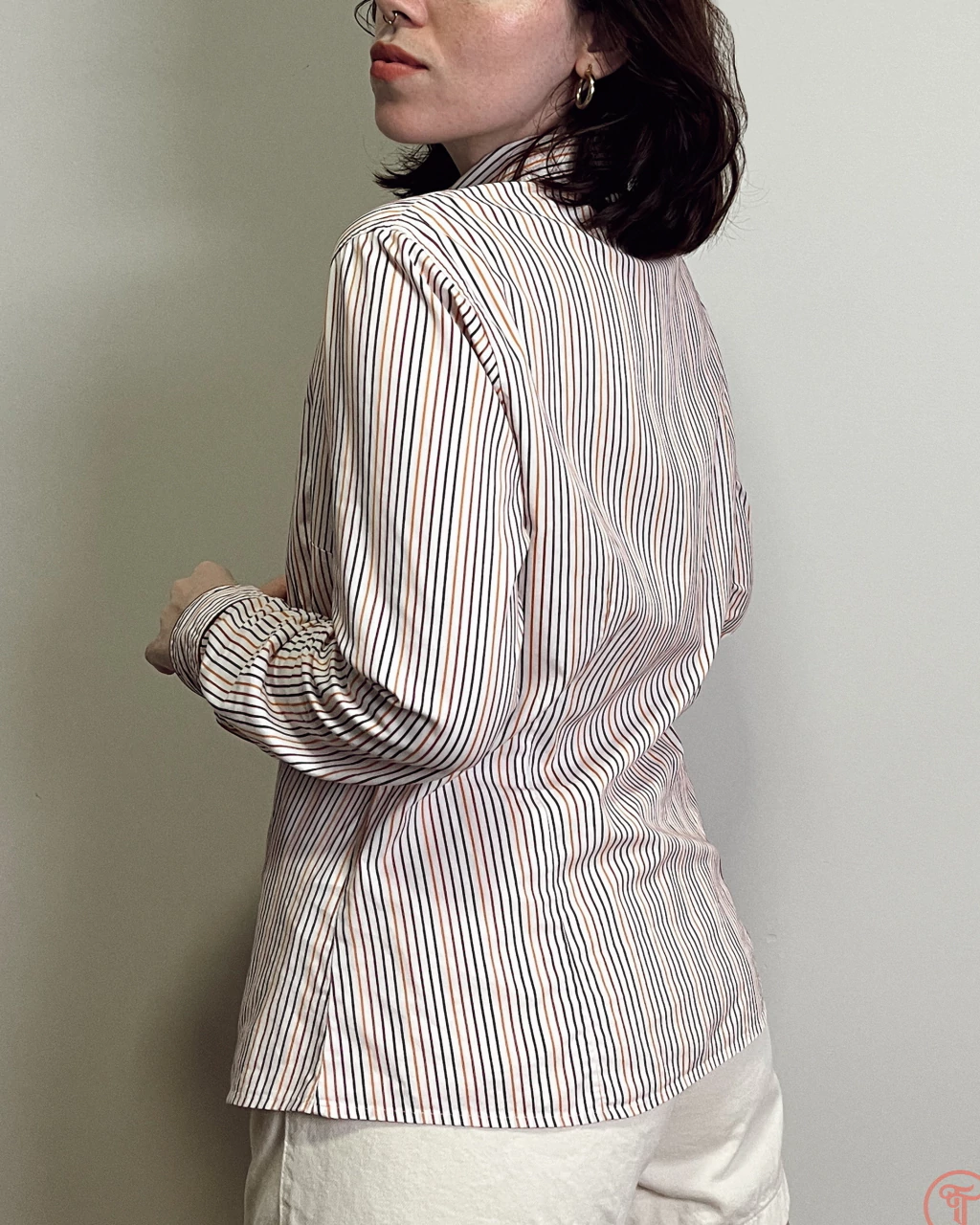 Modelo Slim Fit com estampa em listras coloridas, colarinho redondo Slim e logo da marca bordado na lateral do peito. Apresenta mangas longas, punhos arredondados com botão simples e fechamento em botões no entremeio.