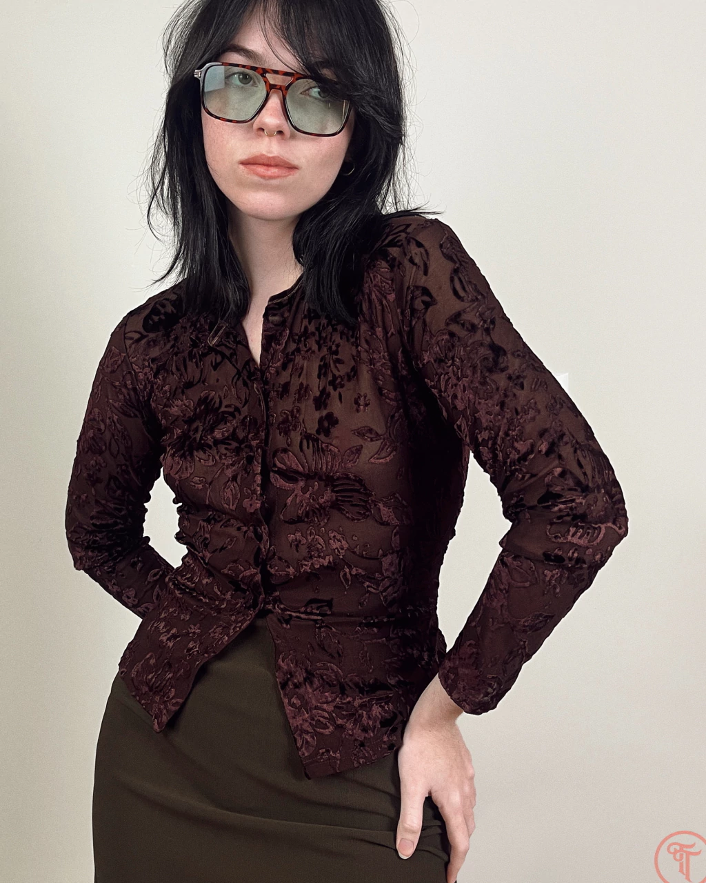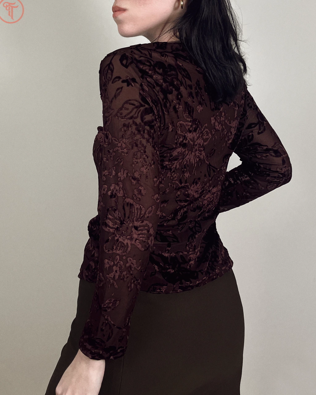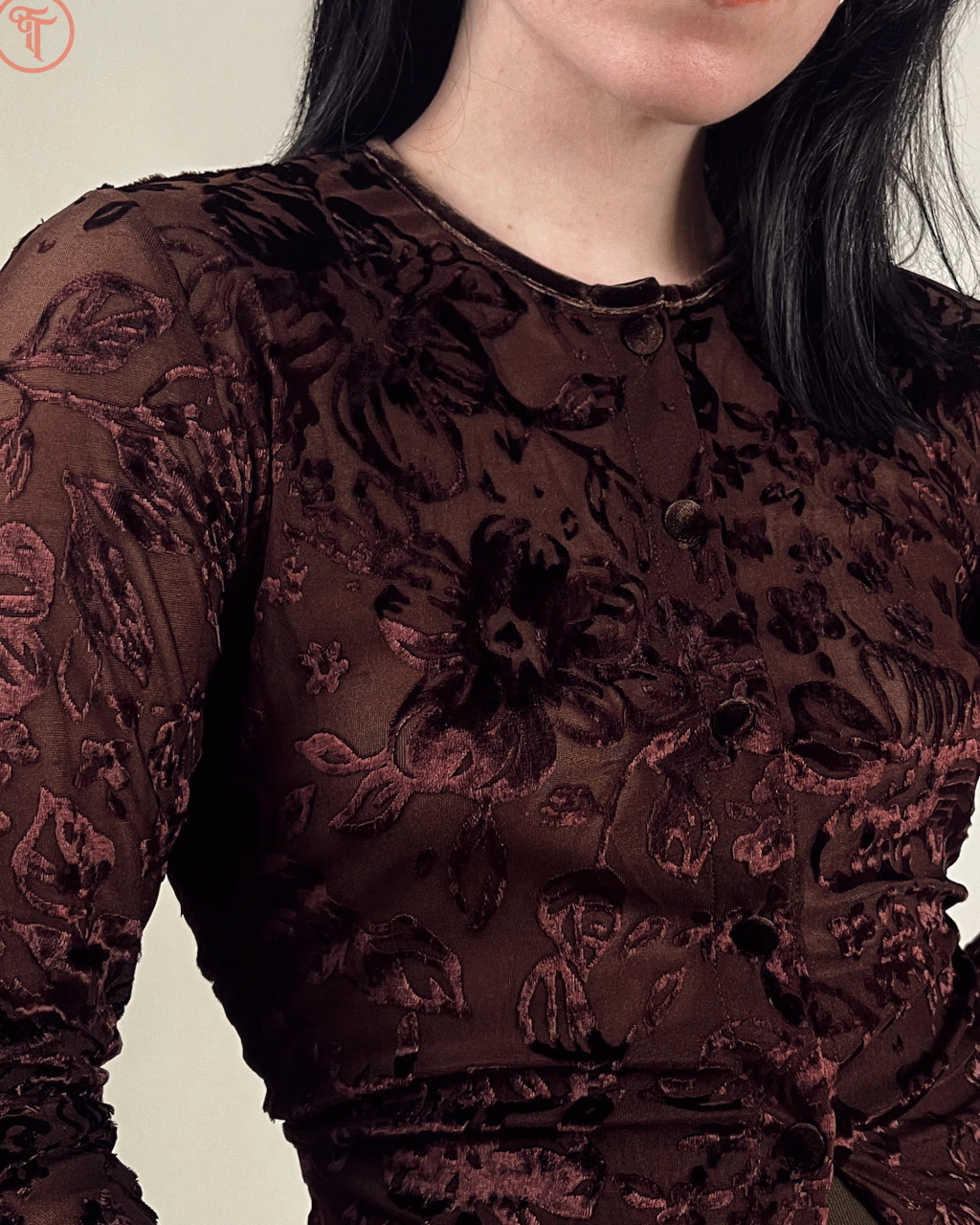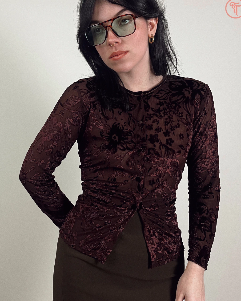 Confeccionada em poliéster com tule em devore velvet, padronagem floral e fechamento em botões encapados em camurça no entremeio (pouca elasticidade).