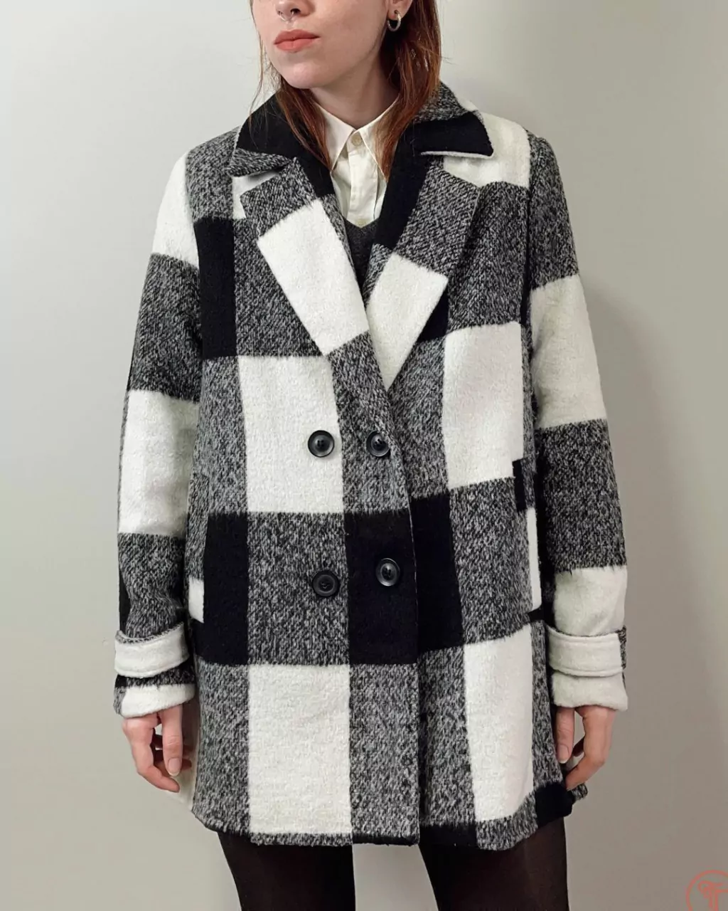 Casaco em lã acrílico, estampa xadrez buffalo, lapela dupla, bolsos frontais, forro em poliéster perfeito estado e fechamento em botões duplos.