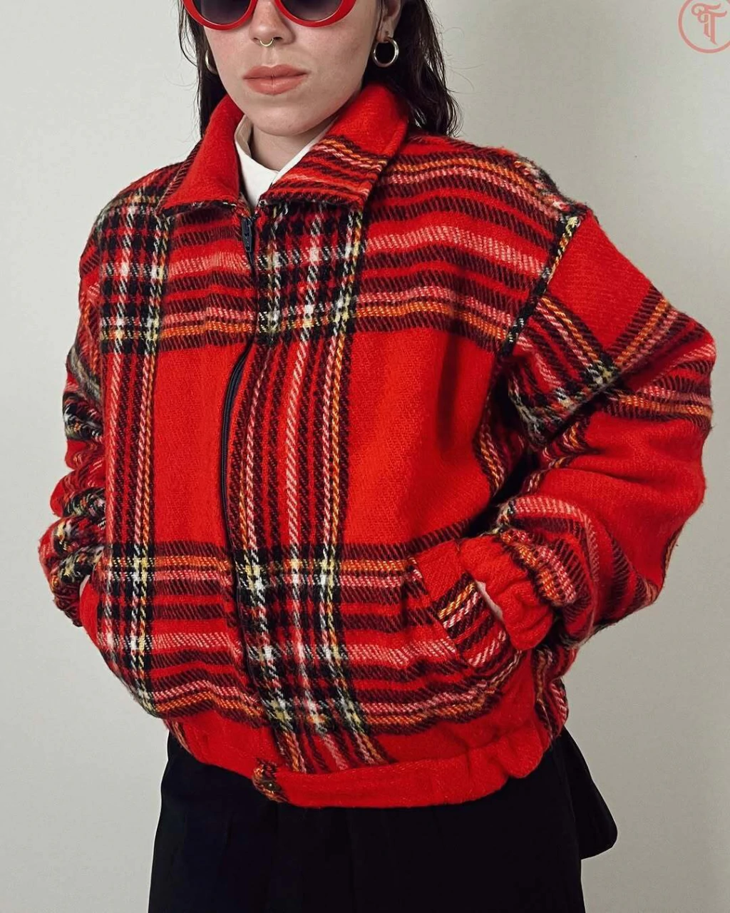 Confeccionado em lã com modelagem oversized. Estampa xadrez tartan, apresenta gola de lapela, bolsos frontais e detalhes franzidos nos punhos das mangas e na barra traseira. O fechamento é realizado por meio de um zíper frontal. Embora não possua forro, o tecido é confortável e não provoca irritação na pele. Trata-se de uma peça extremamente quente.