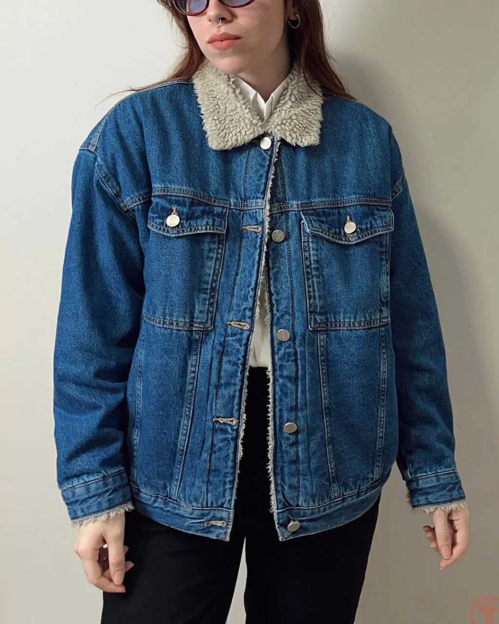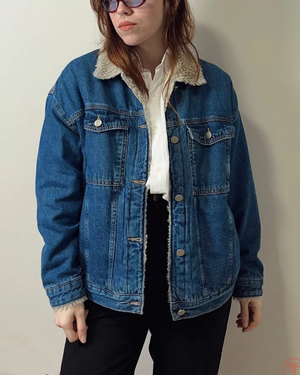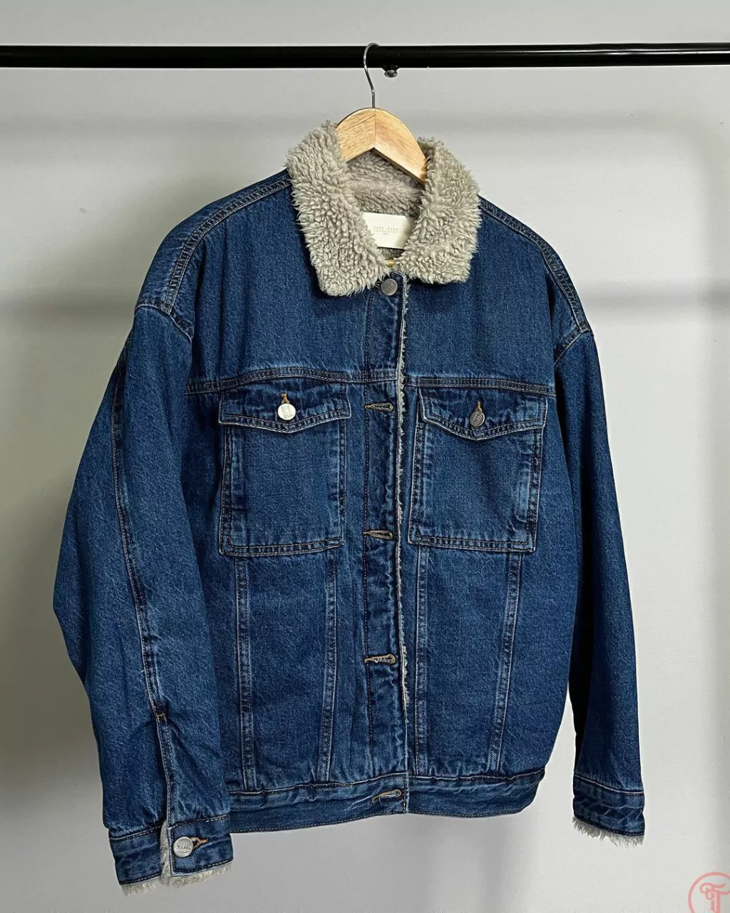 Jaqueta jeans em algodão com forro em pelego, modelagem Over, com quatro bolsos frontais, mangas com botões e fechamento em botões no entremeio.