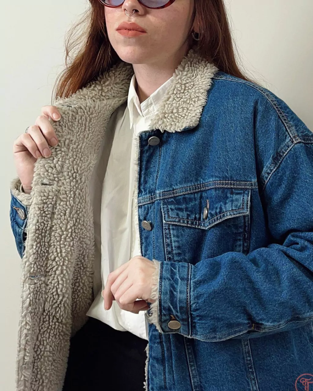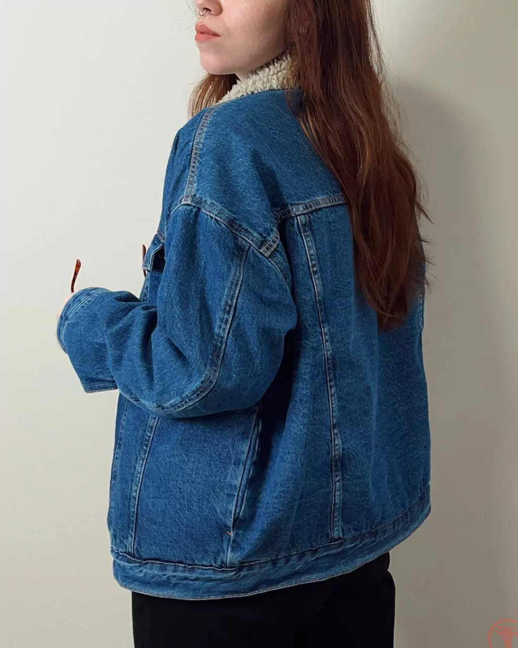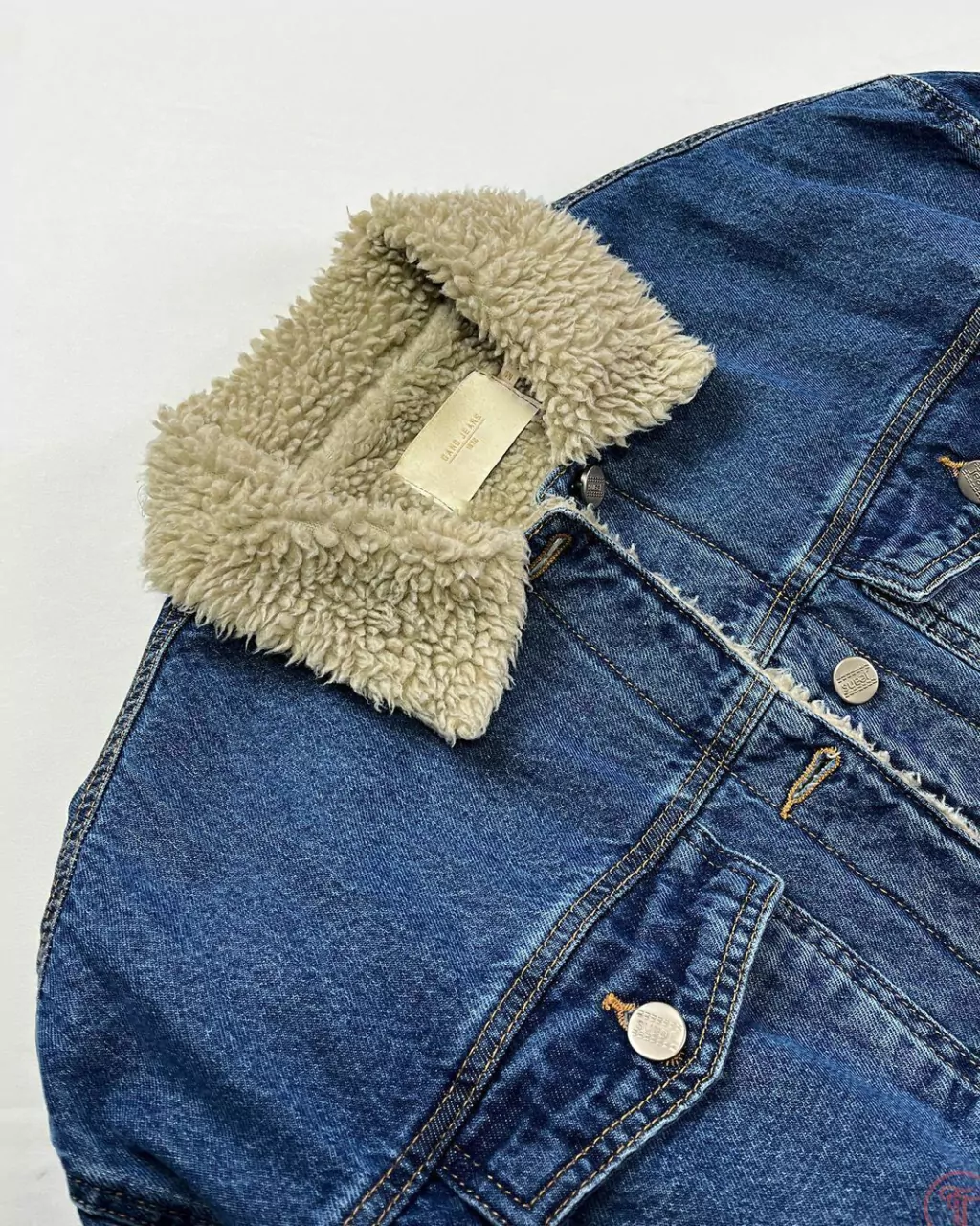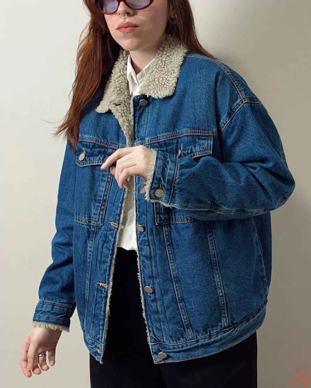 Jaqueta jeans em algodão com forro em pelego, modelagem Over, com quatro bolsos frontais, mangas com botões e fechamento em botões no entremeio.
