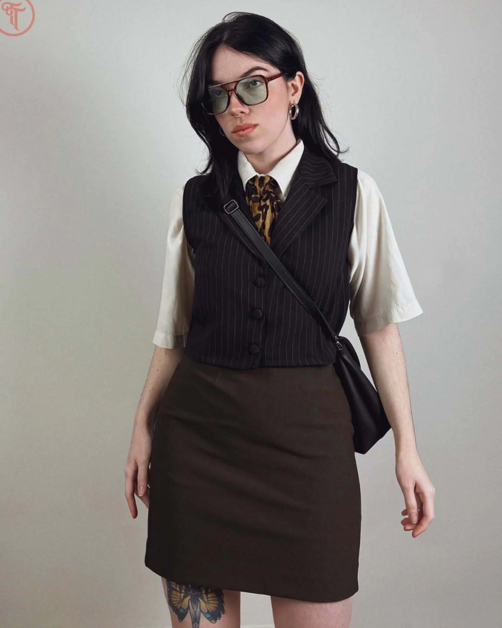 Saia de alfaiataria marrom oliva, modelagem reta, cintura alta e cós de elástico bastante largo. Tecido encorpado com textura riscada e confortável.