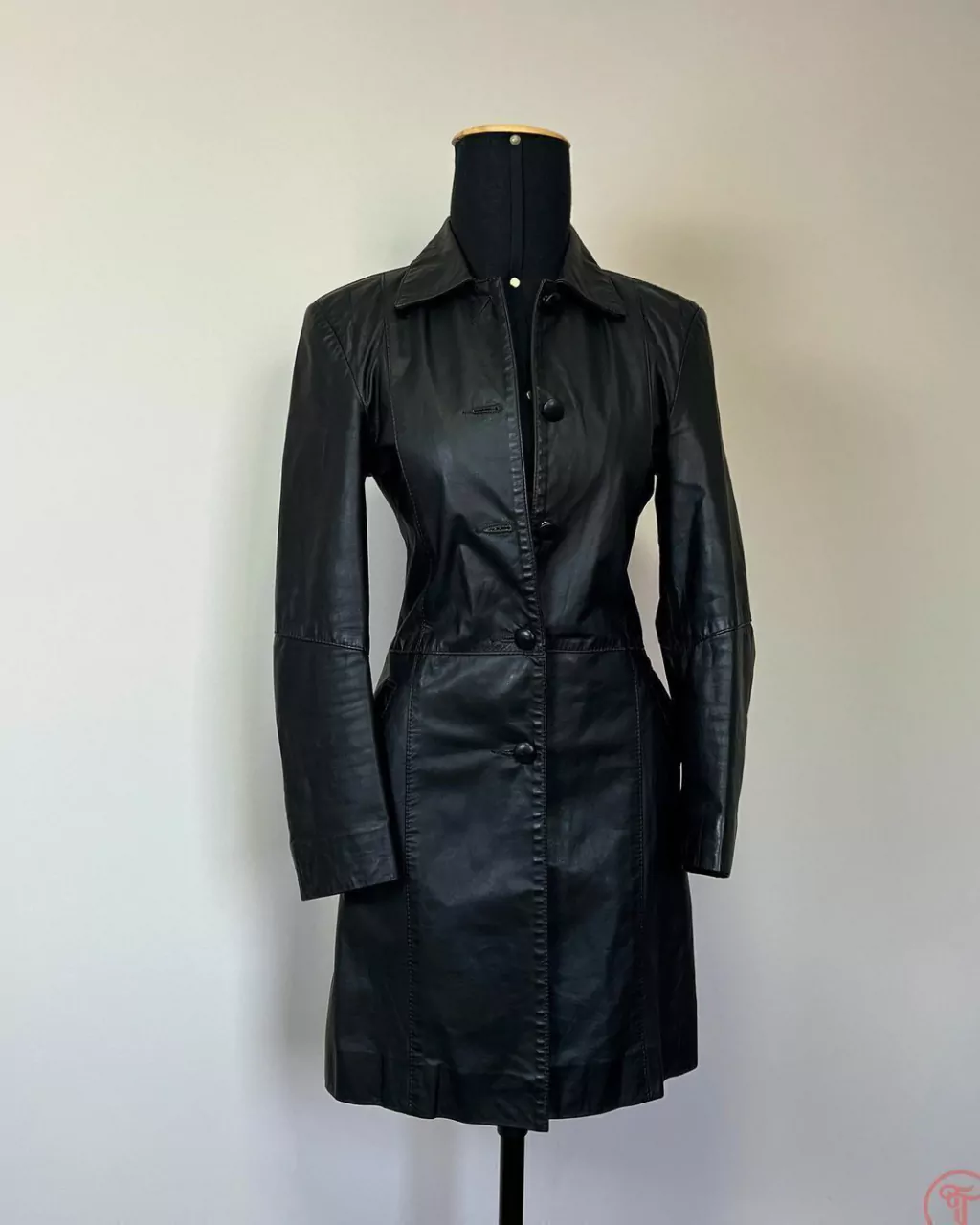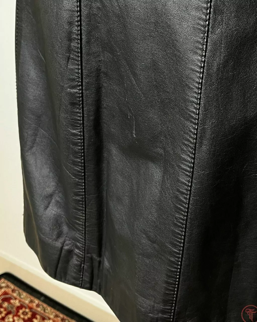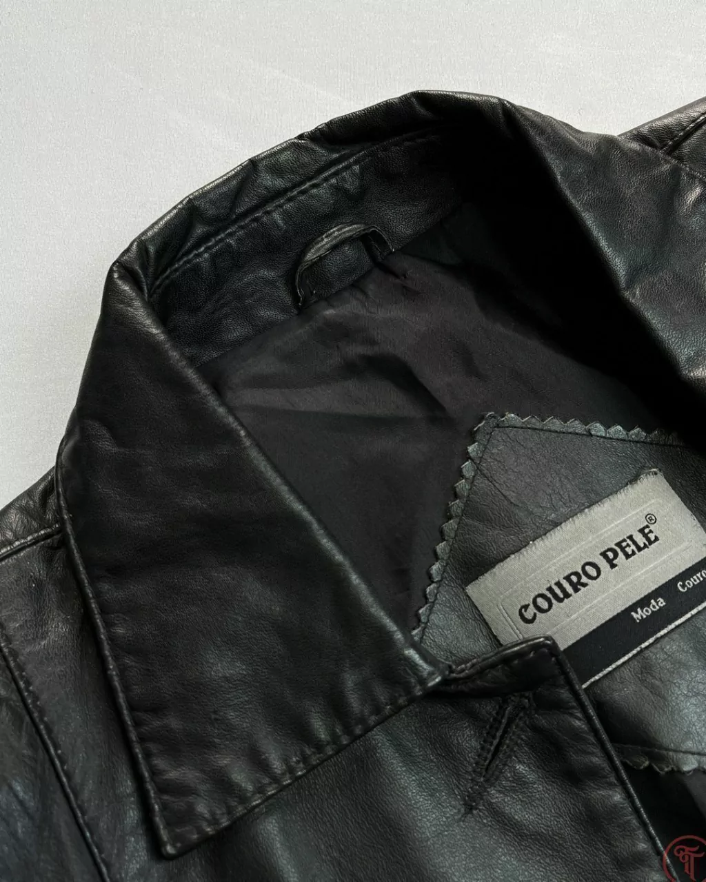Em couro legitimo, possui ombreiras leves, forro em perfeito estado, cinturada com bolsos frontais, fechamento em botões forrados em couro. Comprimento bastante angusto e não possui elasticidade.