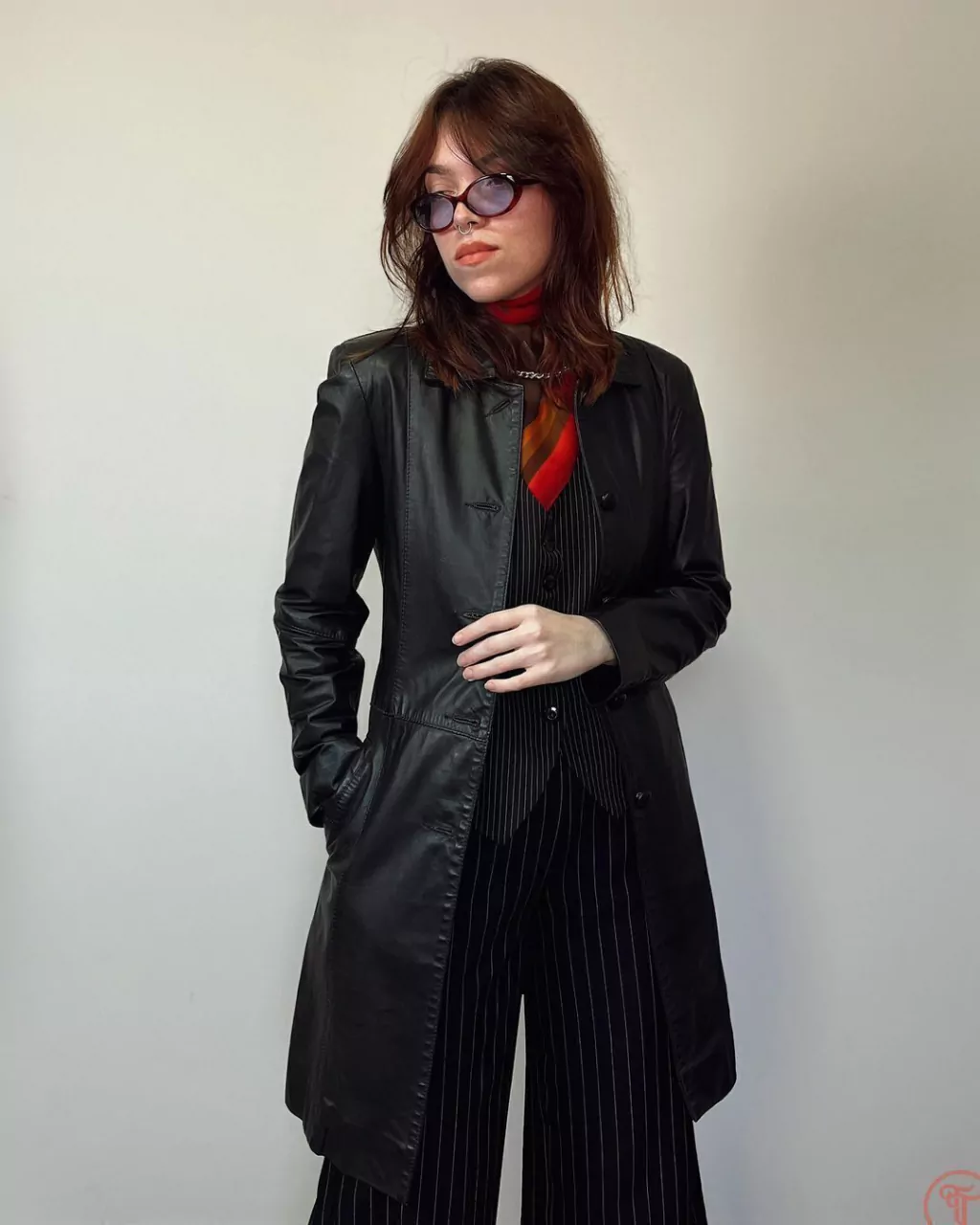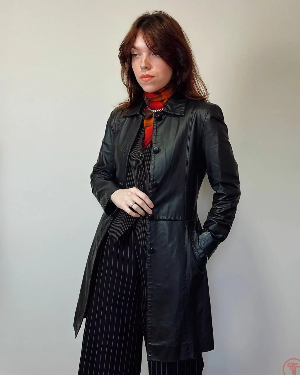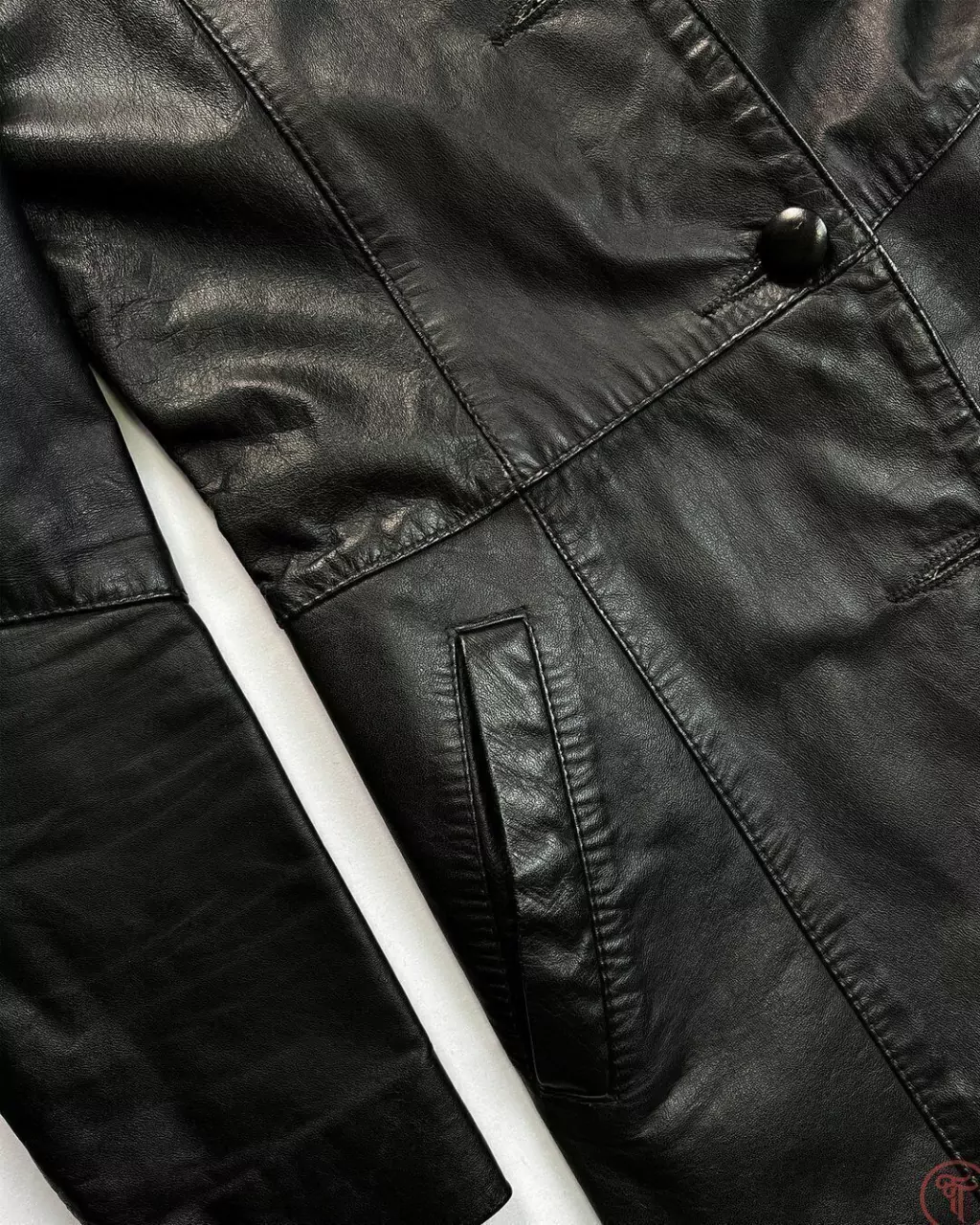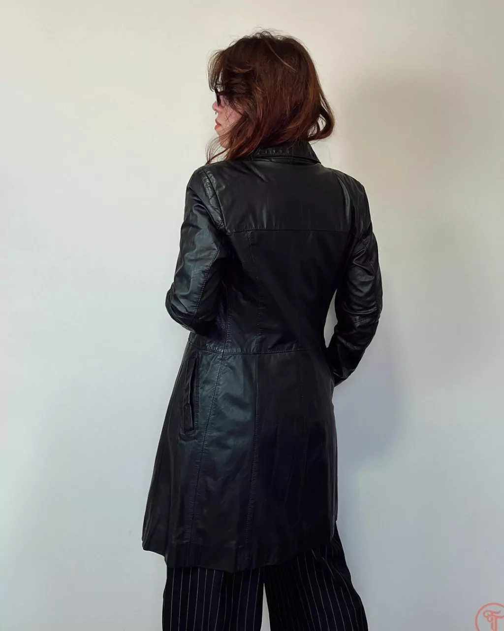 Em couro legitimo, possui ombreiras leves, forro em perfeito estado, cinturada com bolsos frontais, fechamento em botões forrados em couro. Comprimento bastante angusto e não possui elasticidade.