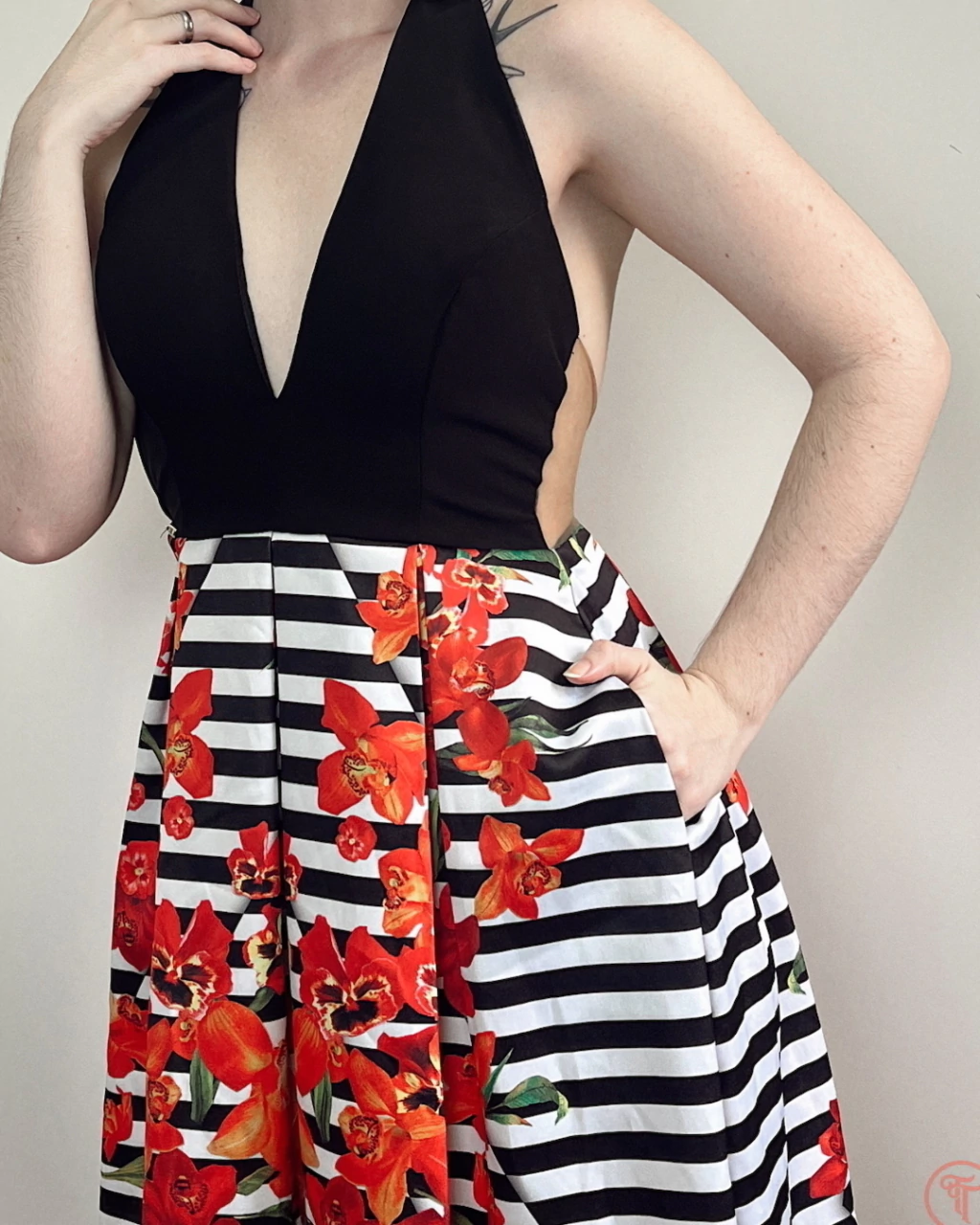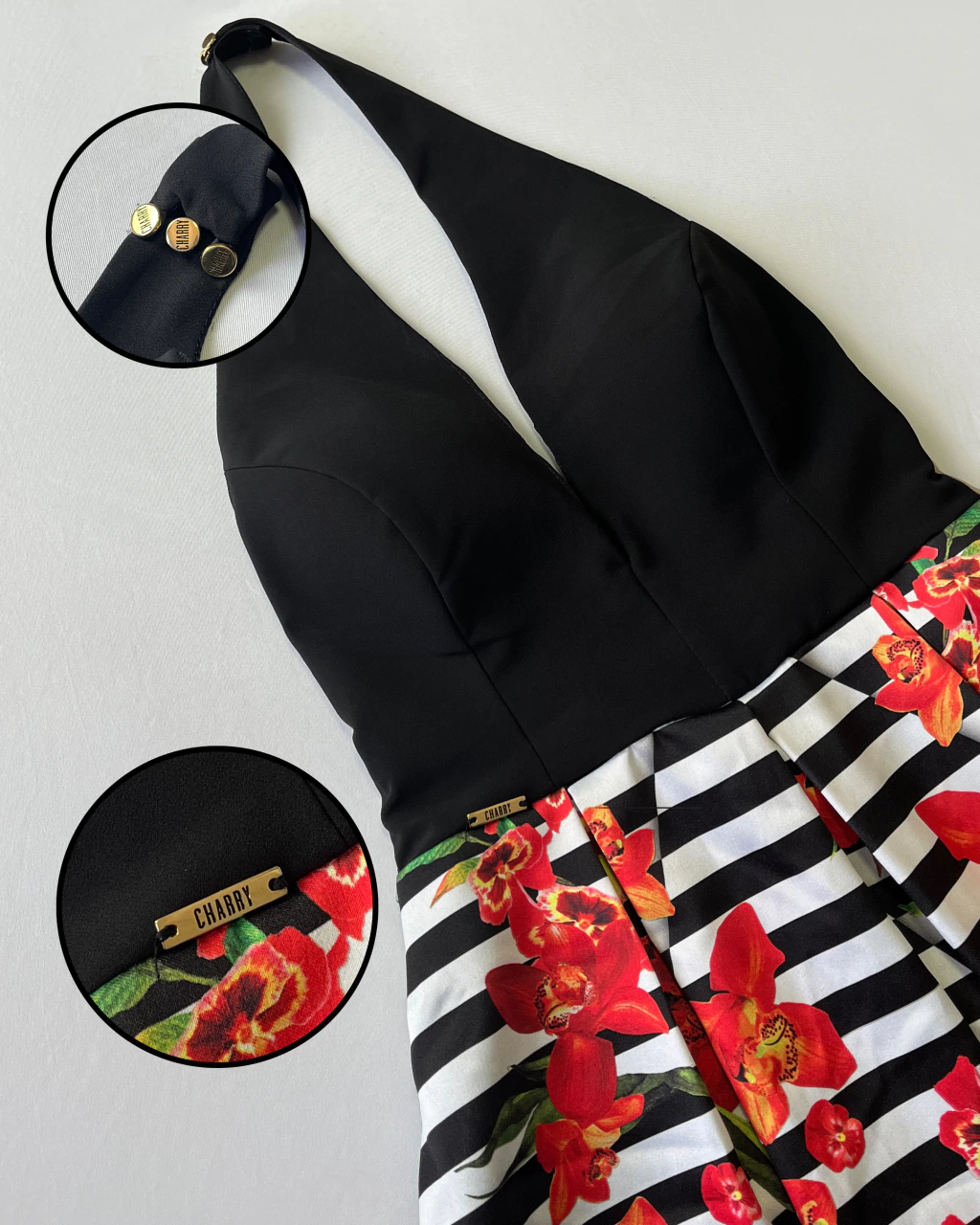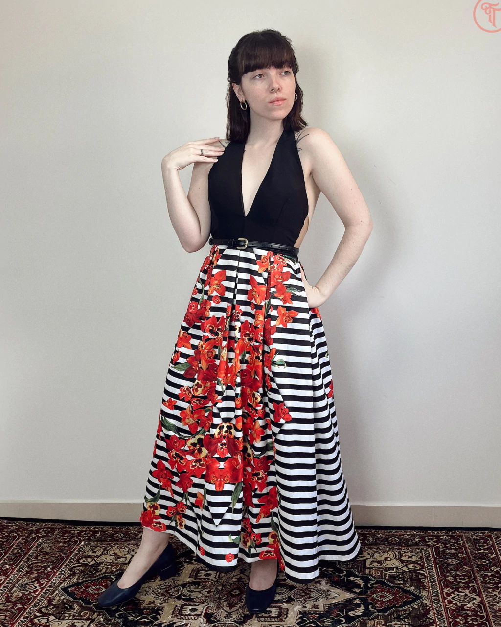 Vestido longo com um mix de estampas, apresentando modelagem frente única e bojo leve. O design inclui detalhes de pregas tanto na parte frontal quanto na traseira, além de bolsos discretamente inseridos. A parte superior é forrada em cetim, proporcionando maior conforto. Nas costas, o vestido conta com um suporte em tule na parte das costa com tonalidade da pele, complementado por um fechamento em zíper invisível.